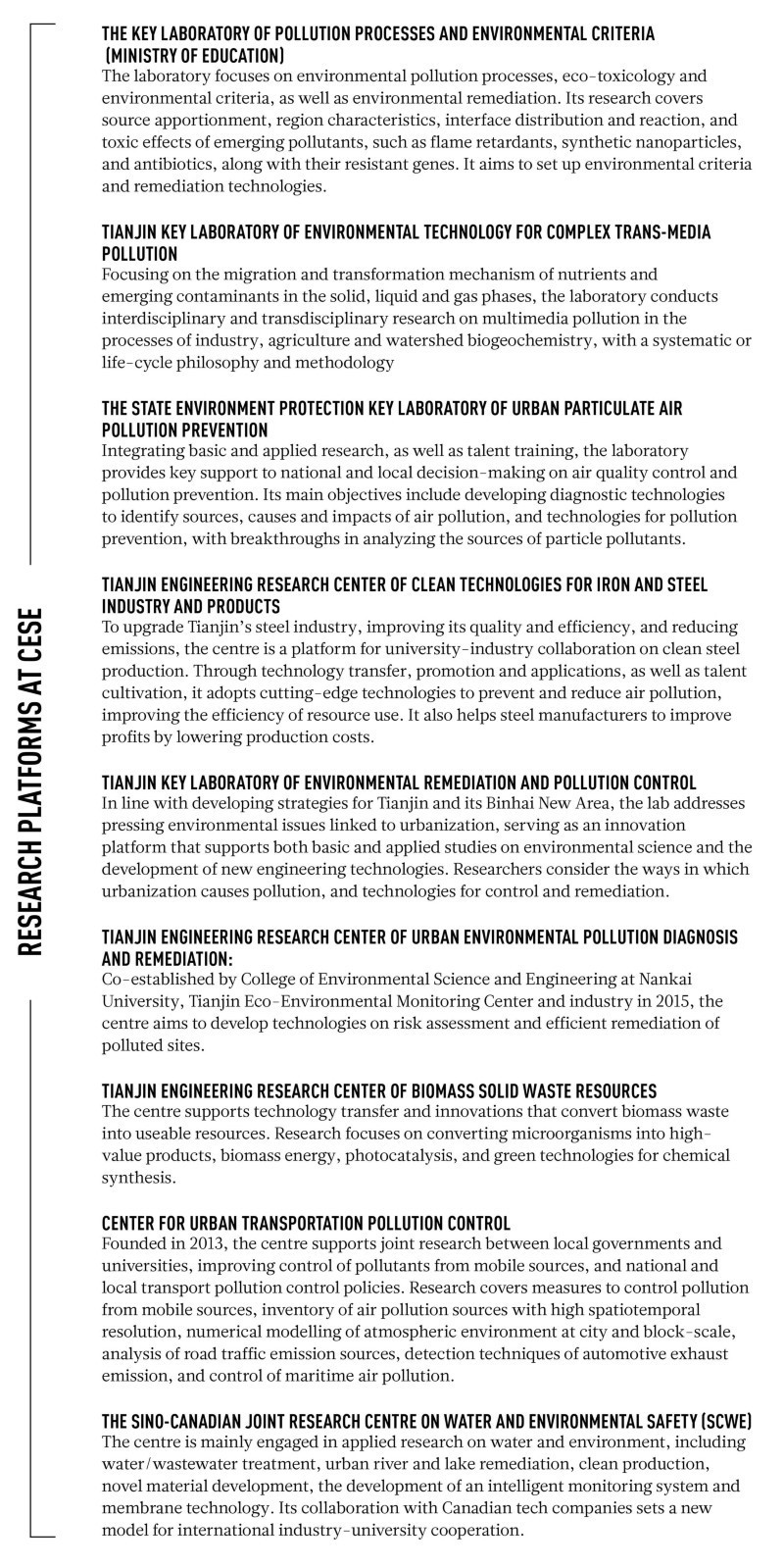Nankai University's College of Environmental Science and Engineering (CESE) is among the earliest providers of environmental science education in China. It is focused on understanding environmental processes and the underlying mechanisms, and developing novel technologies for pollution control. The college's research ranges from environmental geochemistry and toxicology to designing technology for real-time air pollution monitoring. CESE researchers are responding to urgent environmental protection through innovation in wastewater treatment, soil remediation, and resource recycling.